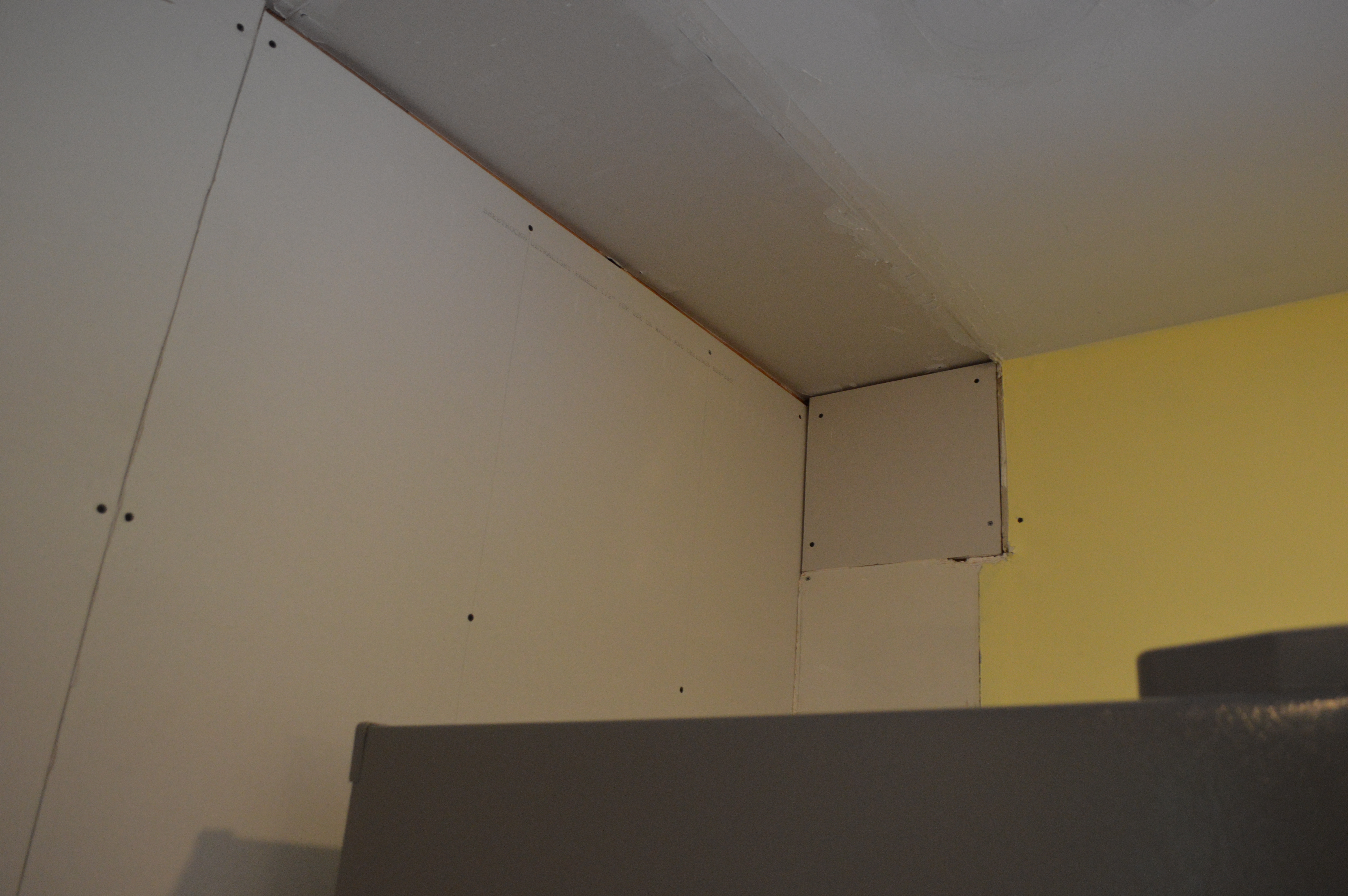 We had to stop and wait for some other unfinished projects (prepping the duct work to add the range hood on the short wall, etc.) but we’re hoping to tackle the rest of the drywall this weekend.