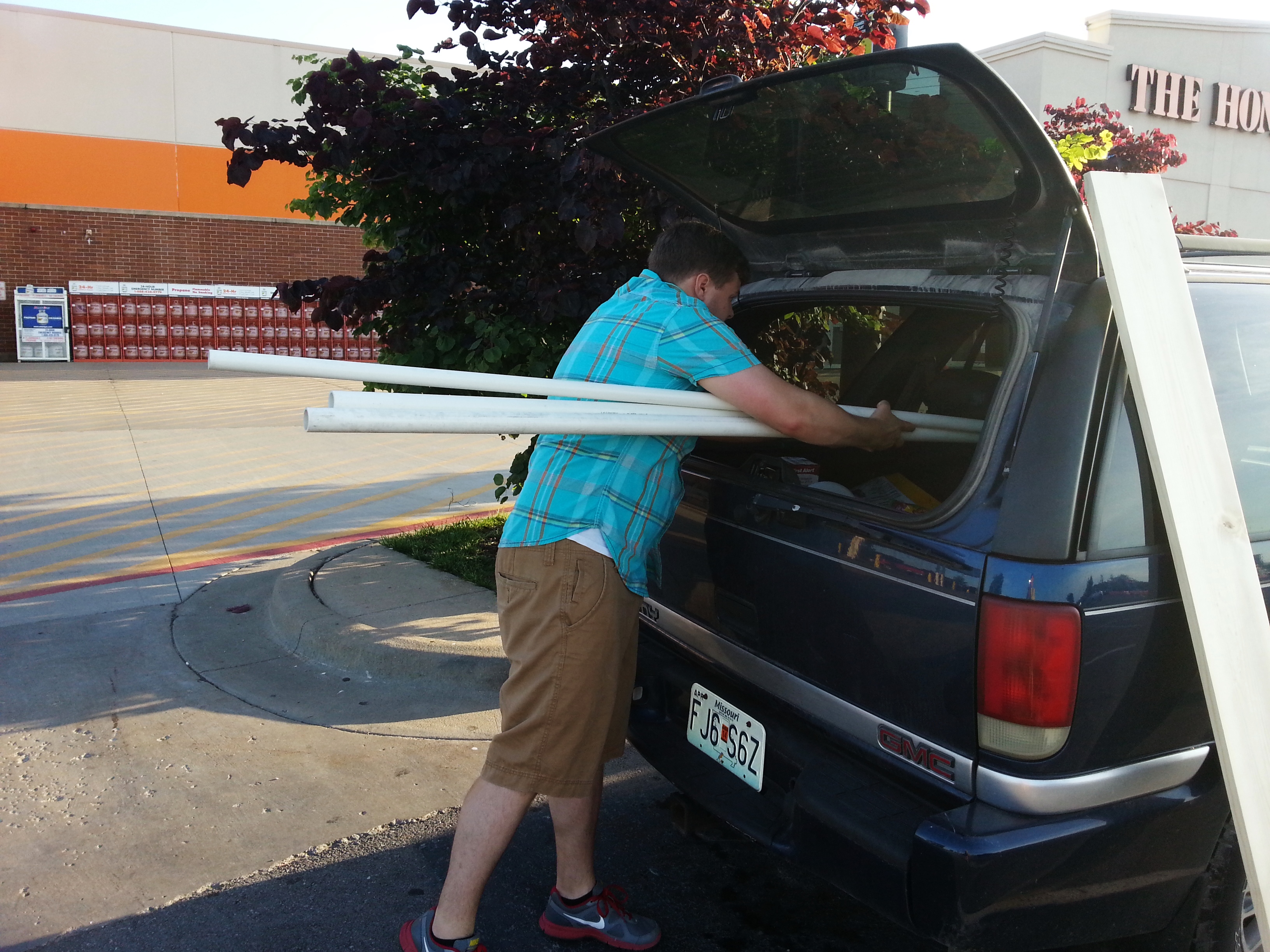 We decided on using 4 poles to hold up some bird netting. We bought 2 ten feet long by 1.25 inch thick PVC pipes and 1 ten foot long by 1 inch thick PVC pipe. The 1 inch pipe fit perfectly inside the 1.25 inch pipe. The plan was to have 4 five foot long corner posts and 4 two foot long stakes that would stick out of the ground to hold up the corner posts.